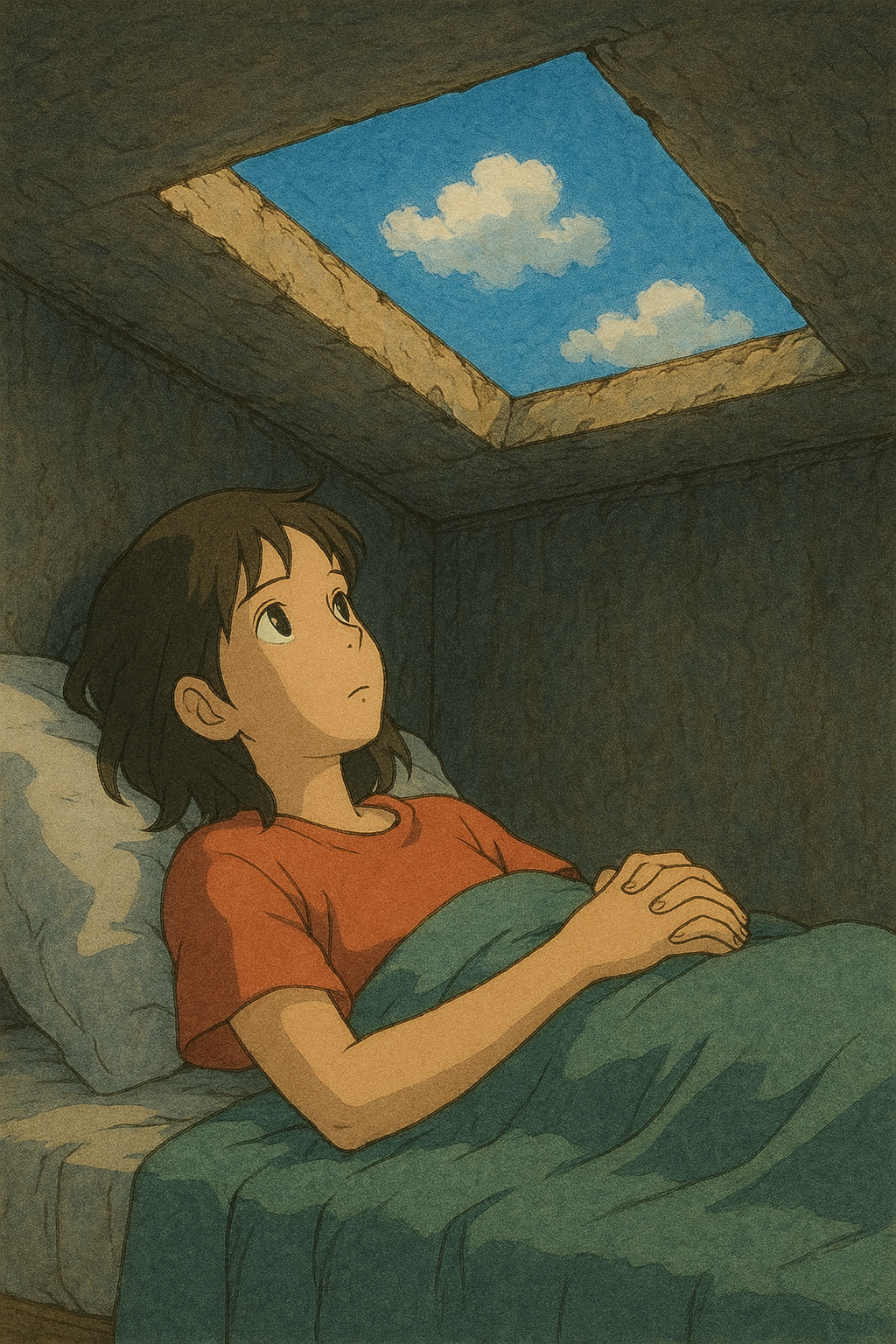 | 97 | 천장에 하늘 무늬 드리운 꿈 | 자유·희망 상징 | 허상·불안 심리 |