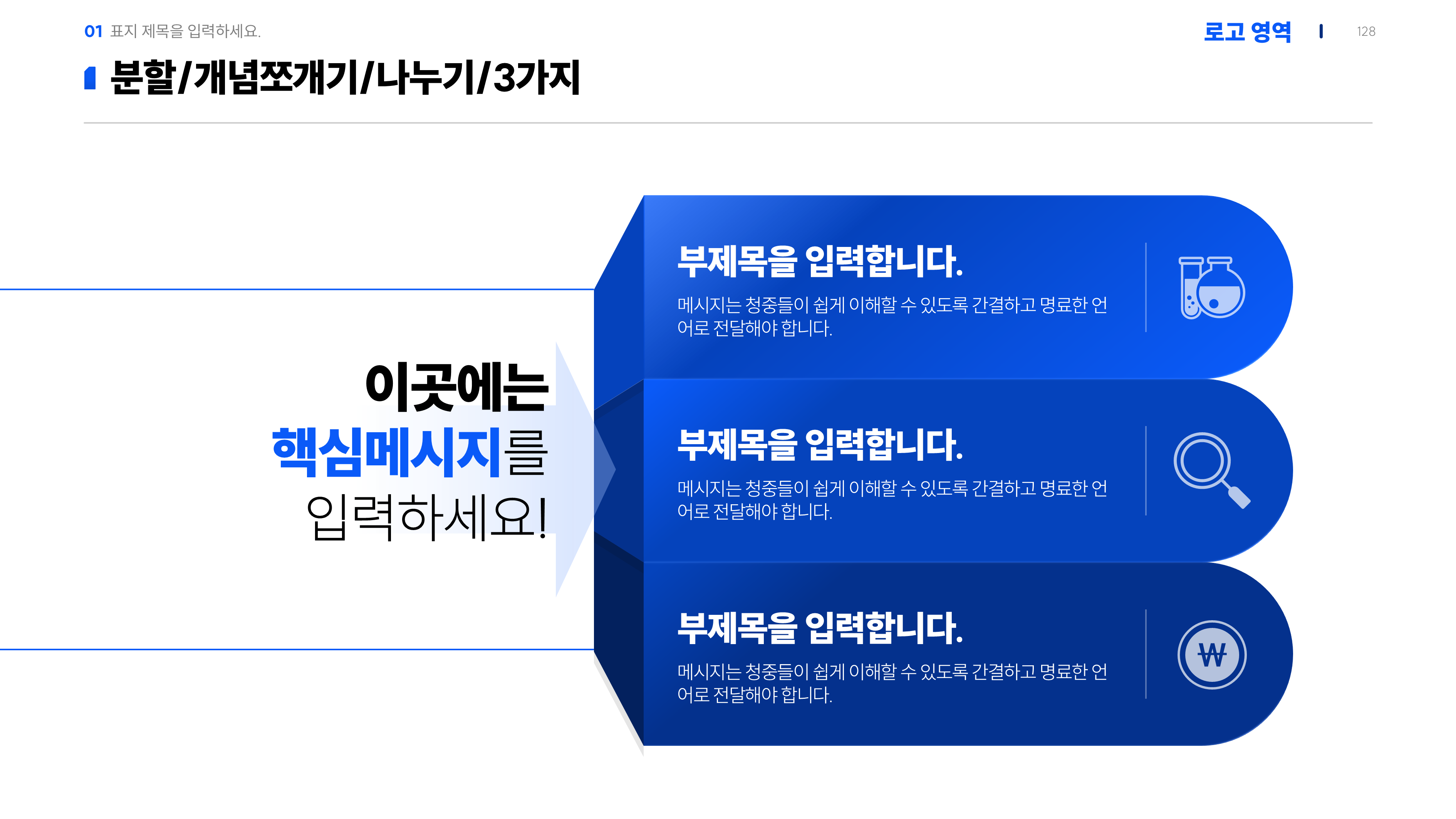 특히 복잡한 콘셉트, 전략, 기획 내용을 세 가지 핵심 요소로 분해해 전달하는 데 최적화된 페이지예요.