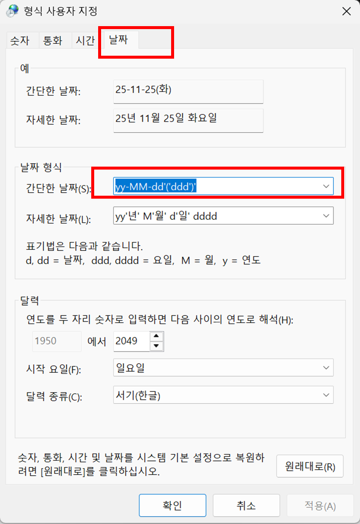 윈도우 11 작업표시줄 날짜 요일 표시저는 작업할 때 윈도우 우측 하단에 날짜 + 요일 표기를 함께 보며 작업합니다.새로 윈도우 11을 설치해보니 기존 방식대로는 요일 표시가 되지 않아, 설정 방법을 정리합니다.한번 시간 들여서 해놓으면 10년은 편합니다!!! 기존에는 위에 날짜 및 시간 조정으로 변경 가능했는데, 지금은 그 메뉴가 보이지 않아서 요일 변경하는 법 소개합니다. 🗂️ 제어판 아이콘을 바탕화면에 추가하기바탕화면에서 우클릭 → 개인 설정왼쪽 메뉴에서 테마관련 설정에서 바탕화면 아이콘 설정제어판 체크 → 적용 먼저, 제어판으로 가야 합니다.제어판은 내 PC 아이콘과 제어판, 내문서, 네트워크 등 아이콘을 추가할 수 있습니다.바탕화면을 우측 마우스 클릭하여, 개인 설정 클릭합니다.개인 설정 >..